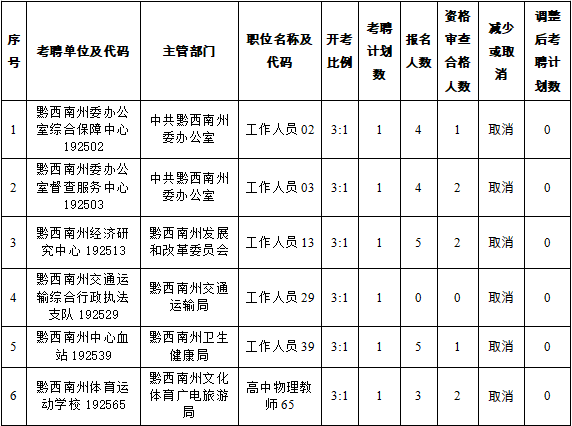 黔西南州2025年度州直事业单位面向全州公开考聘工作人员报名与资格初审工作已结束。根据《黔西南州2025年度州直事业单位面向全州公开考聘工作人员公告》规定,审核通过人数与考聘计划数达不到3:1比例的职位,该职位考聘计划予以减少或者取消。本次计划考聘职位共计84个,因达不到规定开考比例的取消职位数共计6个。现将职位计划取消情况公告如下: