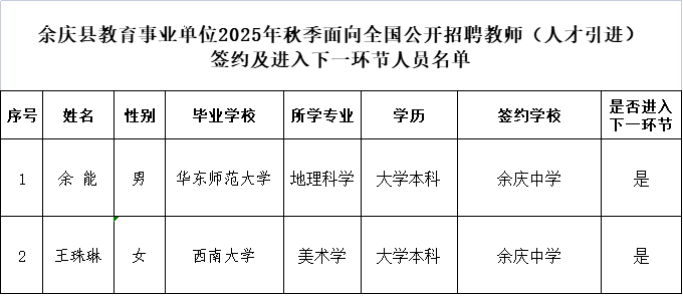 按照《遵义市教育系统2025年秋季面向全国公开招聘公费教育师范生和“优师计划”毕业生(人才引进)简章》要求,现将余庆县教育事业单位2025年秋季面向全国公开招聘教师(人才引进)签约及进入下一环节人员名单(见附件)予以公示。如有异议,请于公示期内反映。